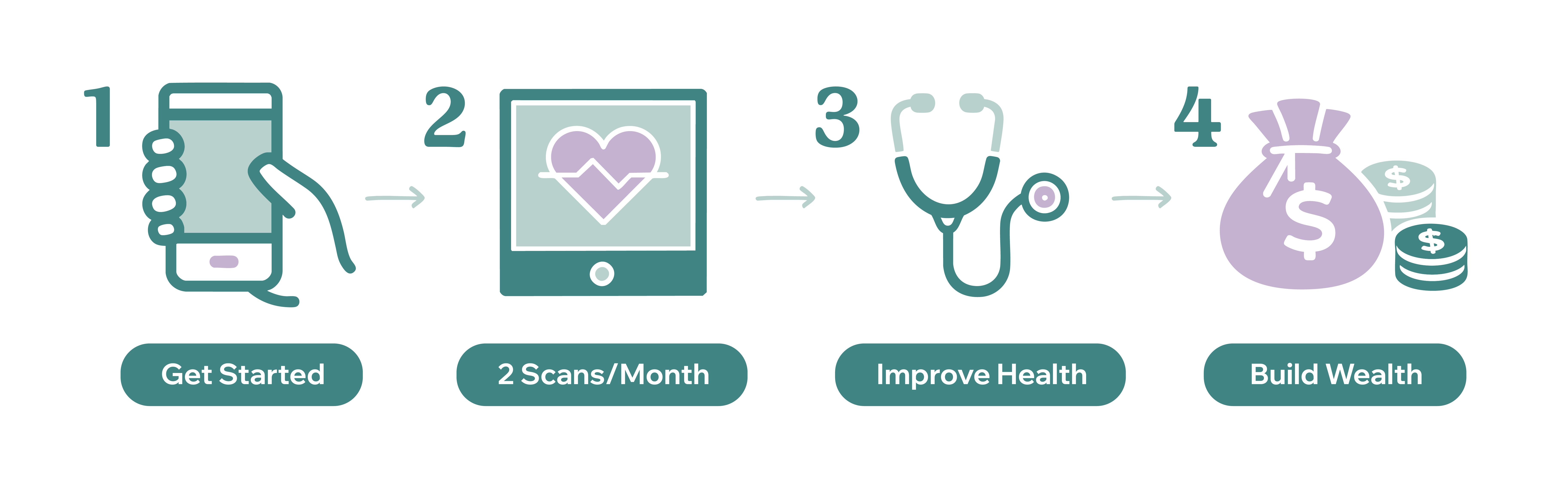 100% preventive care powered by two 60-second monthly scans that keep benefits active, detect health risks early, deliver a full health overview, detect serious conditions early, unlock pension and account contributions, and earn rewards.